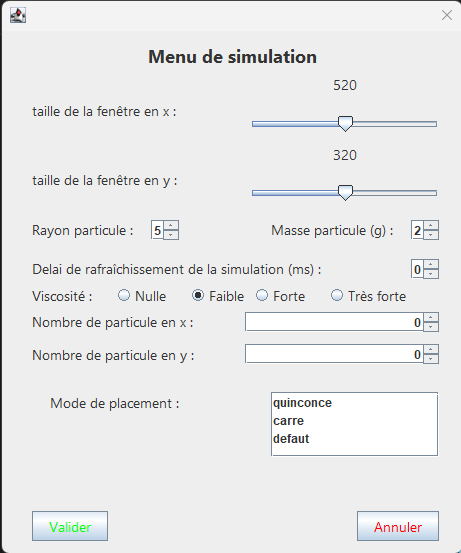 - Interface Utilisateur (UI) : Image du menu de paramétrage du simulateur.